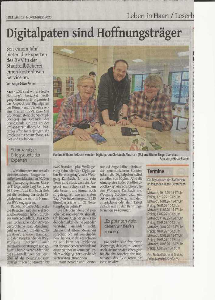 Die freundlichen Digitalpaten des Bürger- und Verkehrs-Verein Gruiten e.V. vermitteln Ihnen Sicherheit im Umgang mit Handy, Tablet und Co.